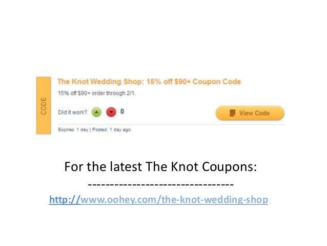 15% Off The Knot Wedding Shop Coupons & Promo Codes ... The Knot Wedding Shop top Coupons for April 2022: 15% Off Promo codes & More! 50 tested and verified The Knot Wedding Shop Coupon Codes. Earn Cash Back on every Purchase.