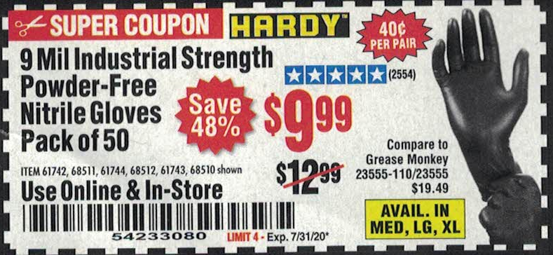 HARDY 9 mil Nitrile Powder-Free Gloves X-Large 50 Pc. for $9.99 through ... (Item 68512) for $9.99 with coupon code 96548991, valid through January 20, 2020. See the coupon for details. Compare our price of $9.99 to Grease Monkey at $19.49 (model number: 23555-110/23555). Save 48% by shopping at Harbor Freight. Nitrile gloves provide better chemical resistance than latex and won't trigger latex allergies.